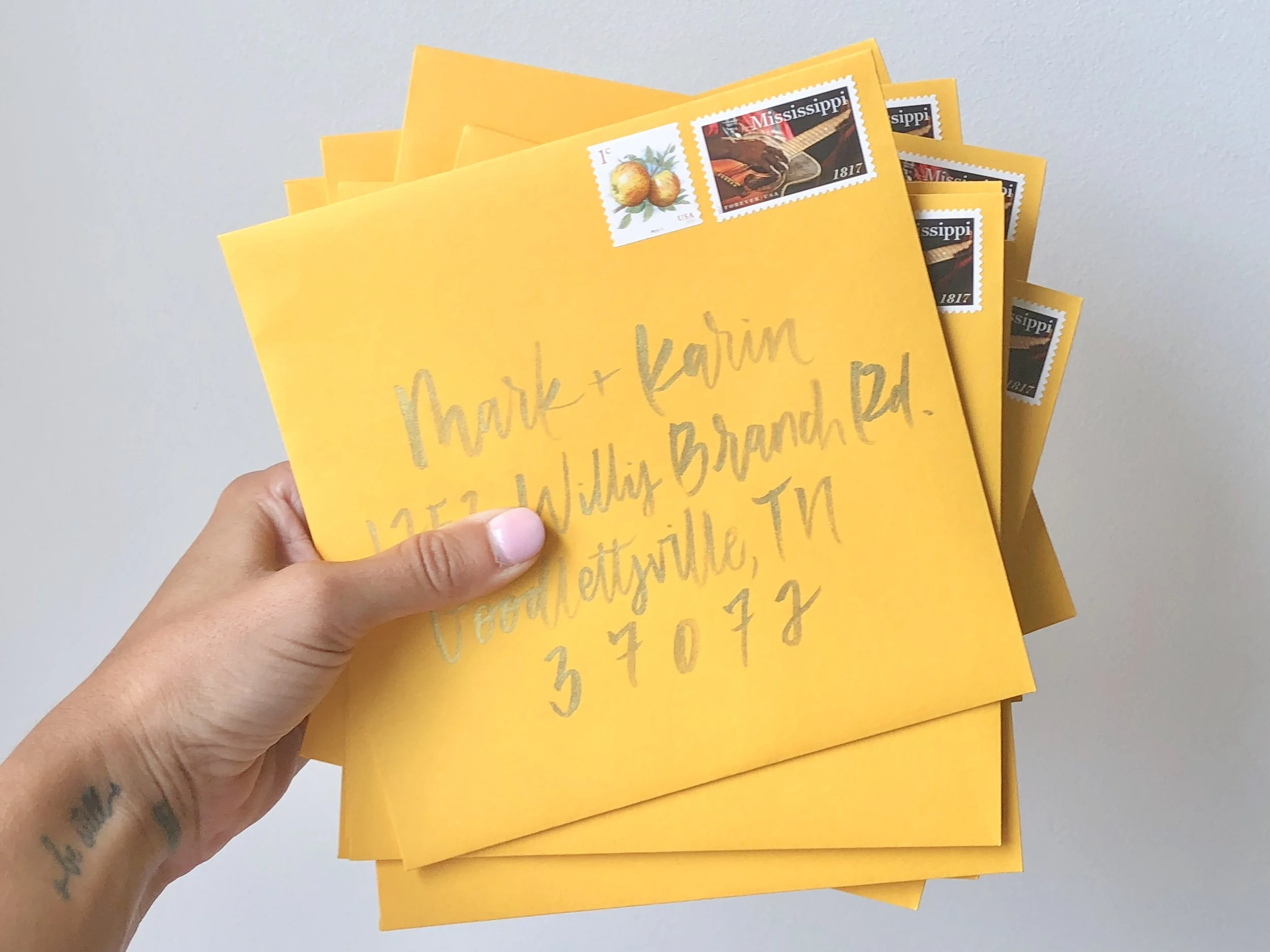 I pulled the colors + geometric elements from the beer can to design the invitation. I wanted to do something different - so we opted for square invitations. Paired with citrine envelopes with gold glitter envelope liners; topped off with gold brush lettering.