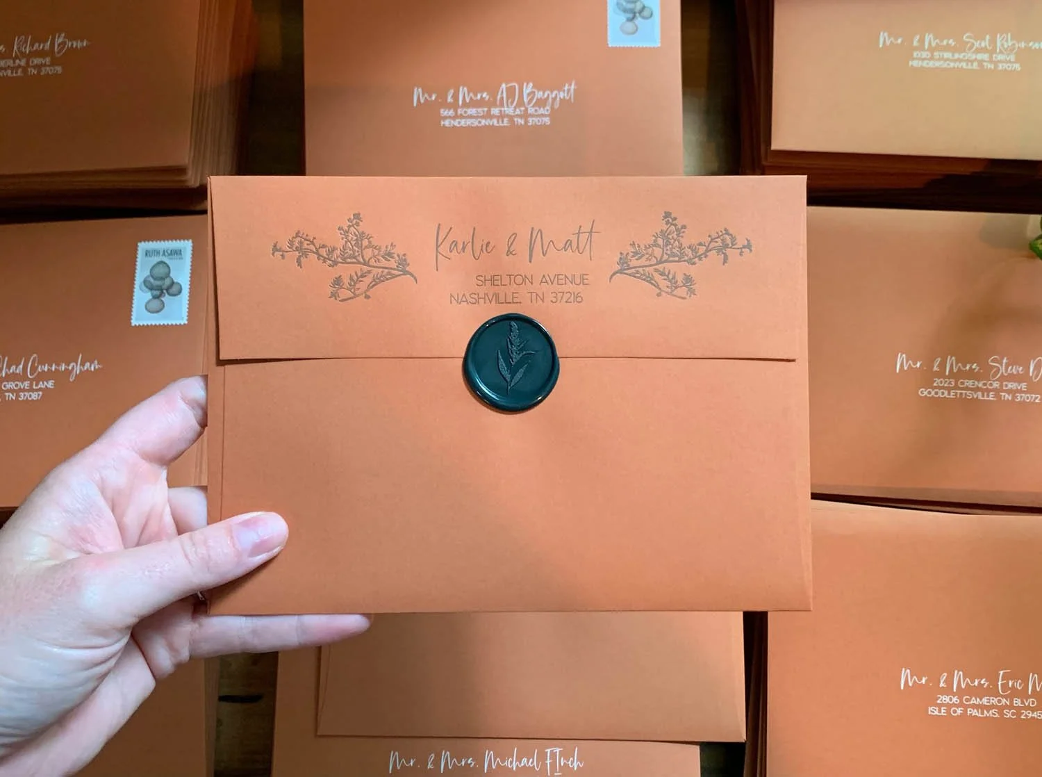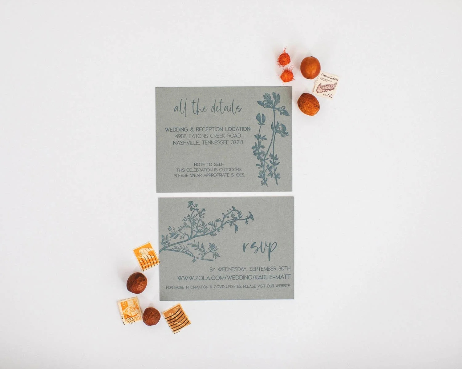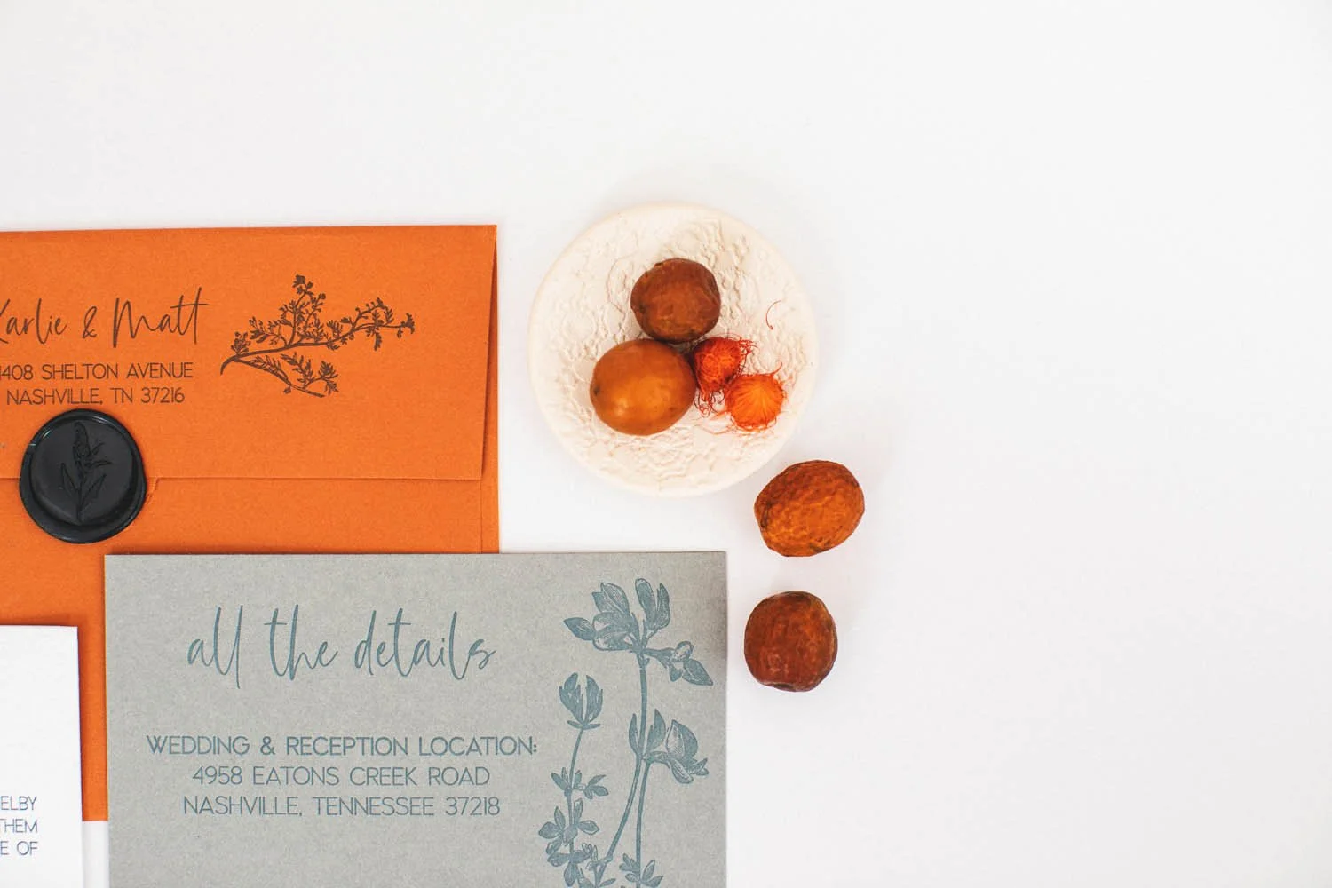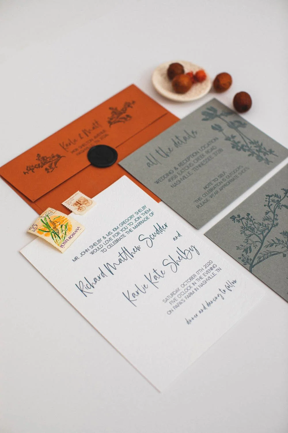 A Nashville wedding on a gorgeous family farm! We used a nature inspired color palette with botanical elements to express the bride’s love for the outdoors. A detail not to be overlooked was the background texture on the invitation. This texture was taken from the fabric pattern on Karlie’s wedding dress. The bride & groom also wanted their family and friends to be safe at their celebration, and provided all guests with custom pressed face masks.