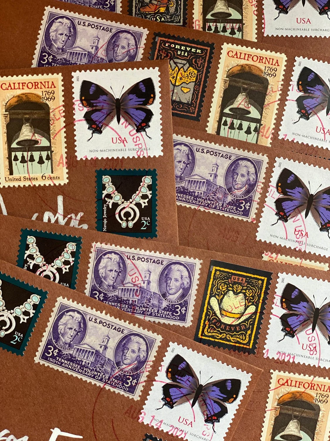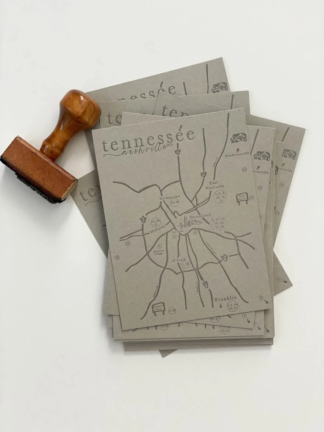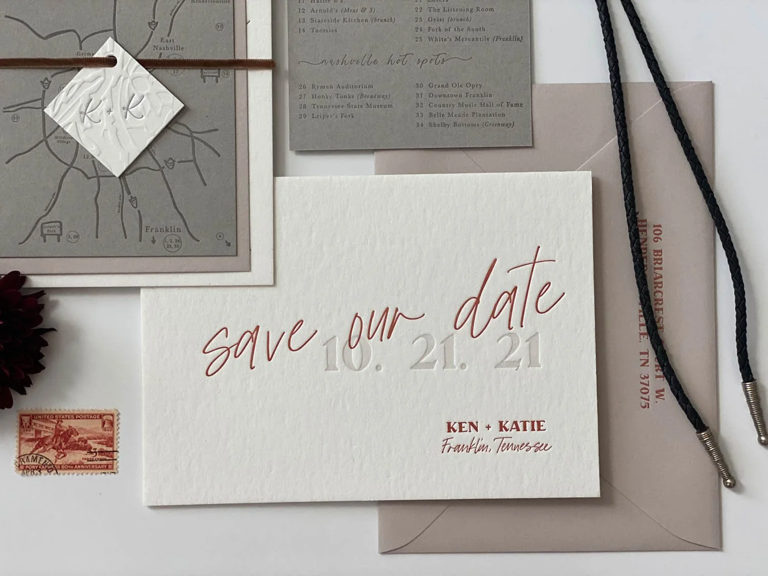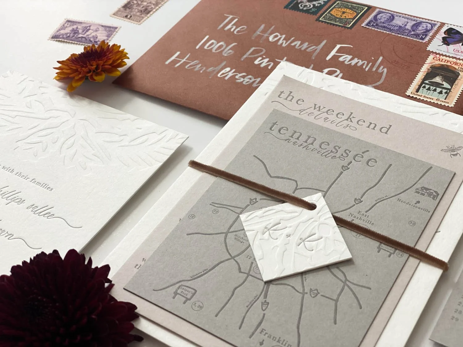 Both bride and groom recently moved to Tennessee from California. They decided to host a beautiful barn wedding here in Franklin, Tennessee, the state they now call home. We designed the stationery using a neutral color palette with pops of West Coast flair. There is vintage postage representing Tennessee and California. We also captured part of the beautiful texture on Katie’s wedding dress on the invitation and tag. Honeybees hold a special place for the bride, so we tucked a few tiny bees into the design. Since the majority of their guests were traveling from out of state, we created a custom map of the Nashville area highlighting the location of their new home, favorite local spots & wedding festivities.