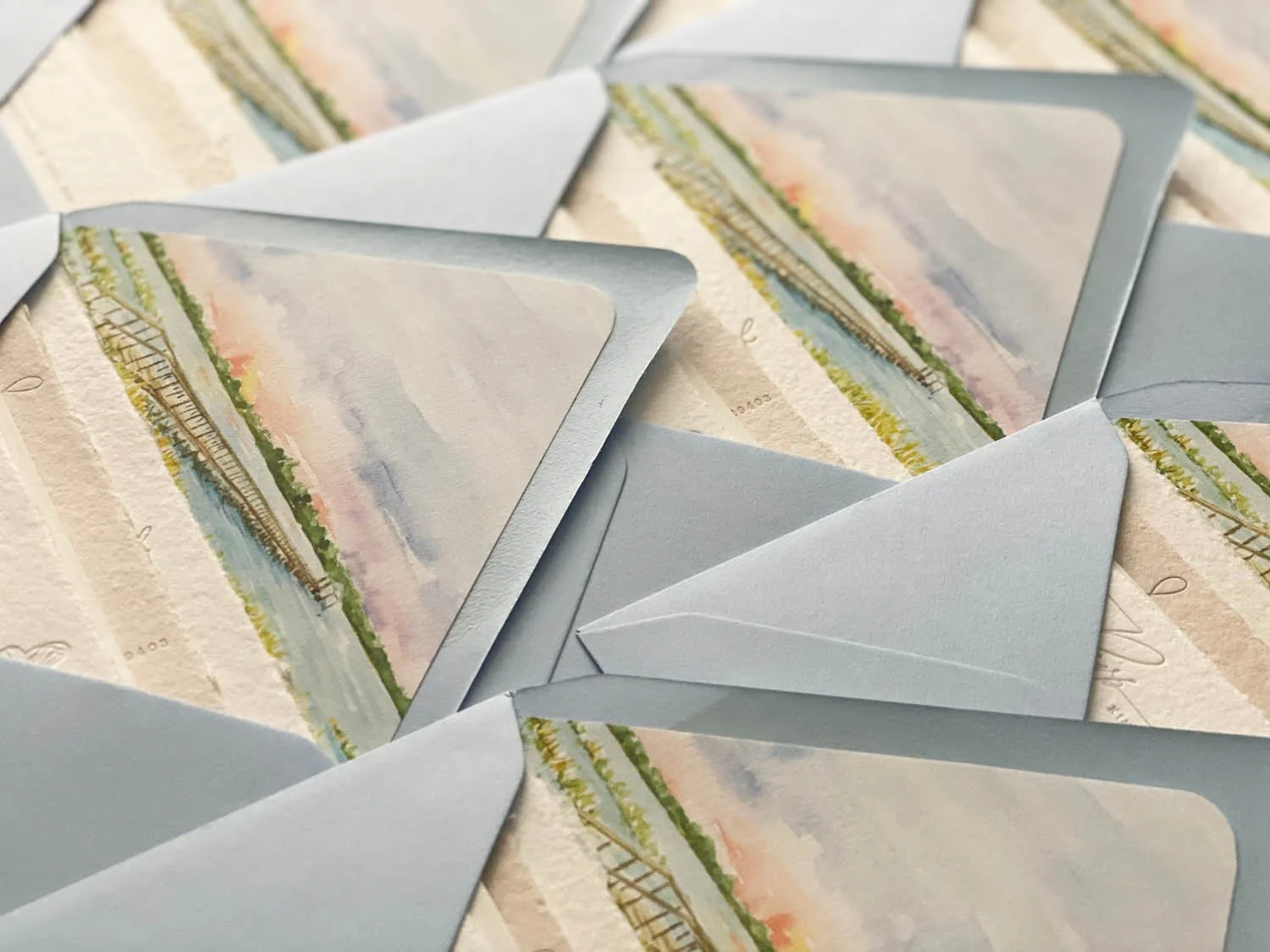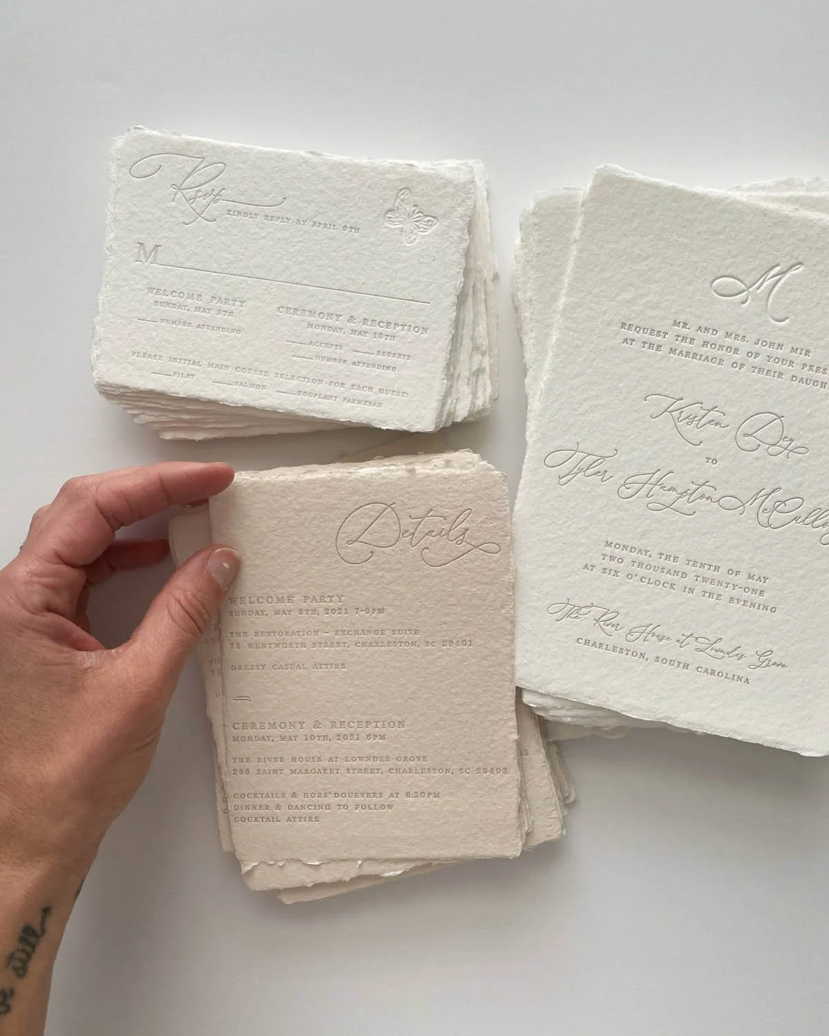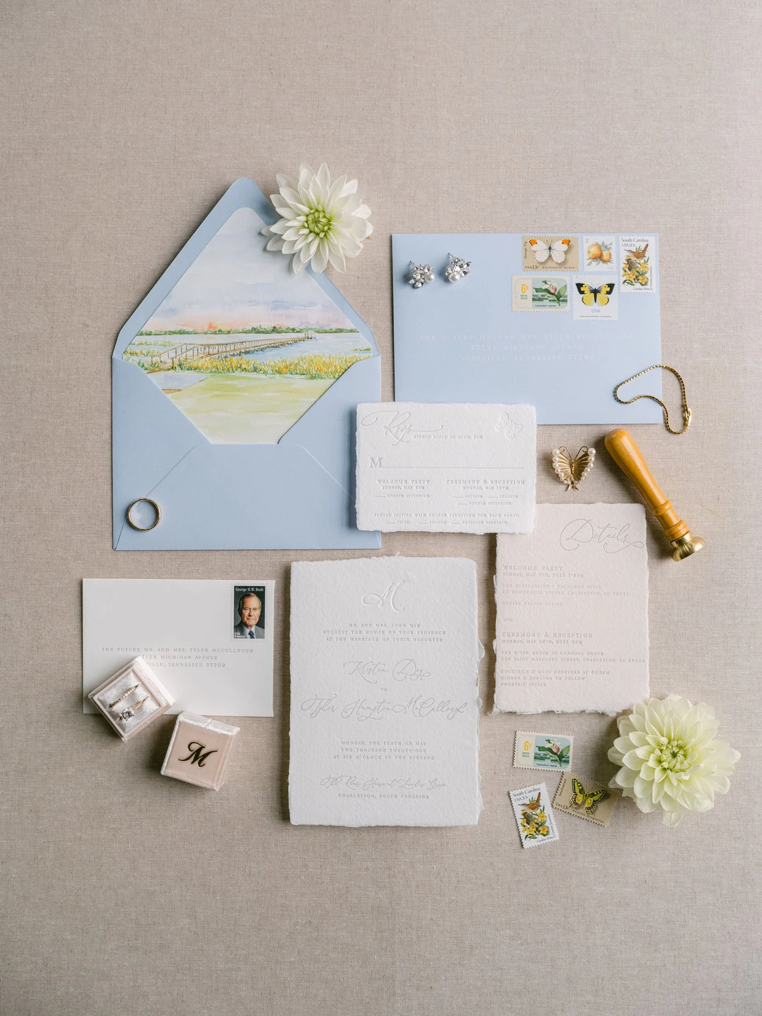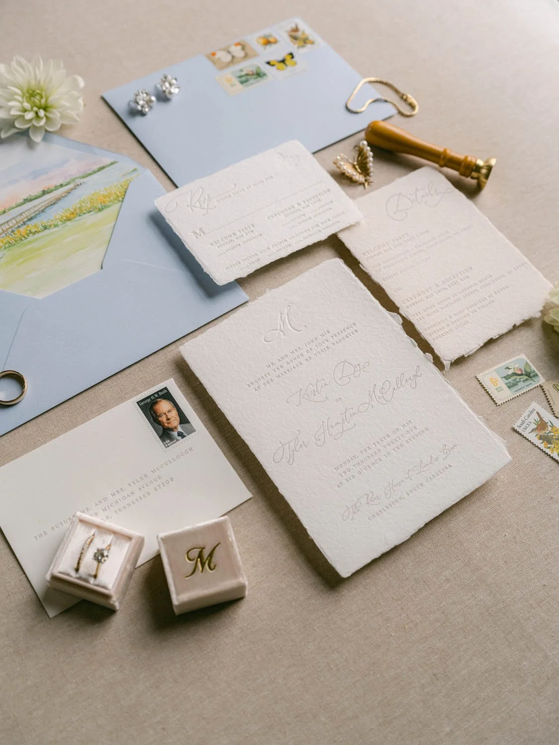 Starting with the Save the Dates, the delicate handmade paper set the tone for this intimate and romantic destination wedding, set on the water in Charleston, South Carolina. A blind deboss butterfly placed throughout the stationery in memory of the bride’s maternal grandmother was sentimental detail that tells the story of the great love in this family. The watercolor envelope liners painted by a local Charleston artist, show the gorgeous views of the venue. And the vintage postage was curated showing homage to South Carolina and again, the butterfly. All captured beautifully by Virgil Bunao.